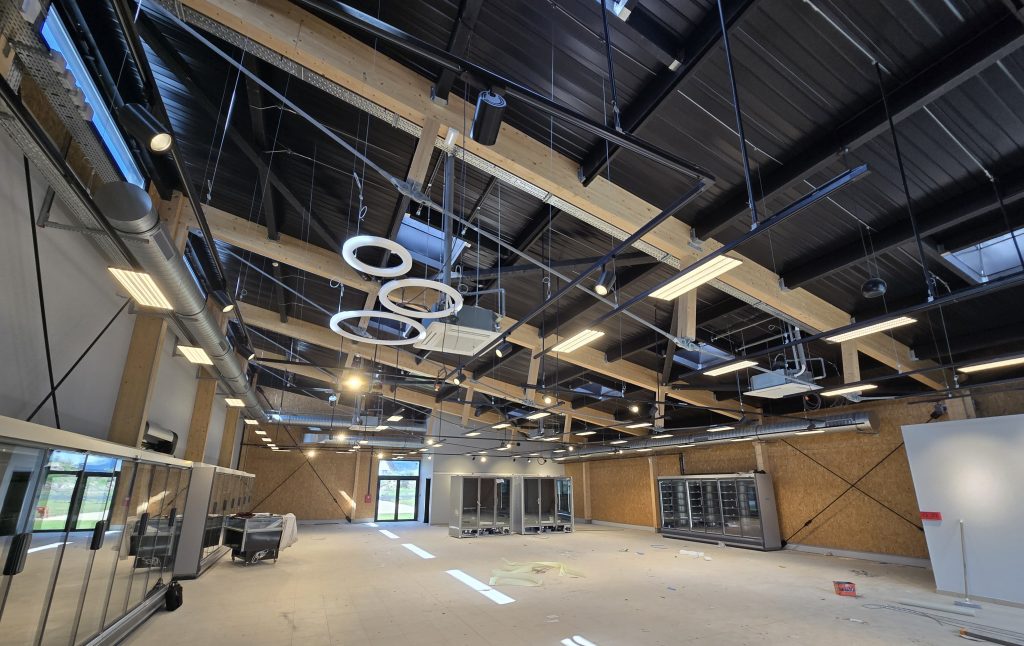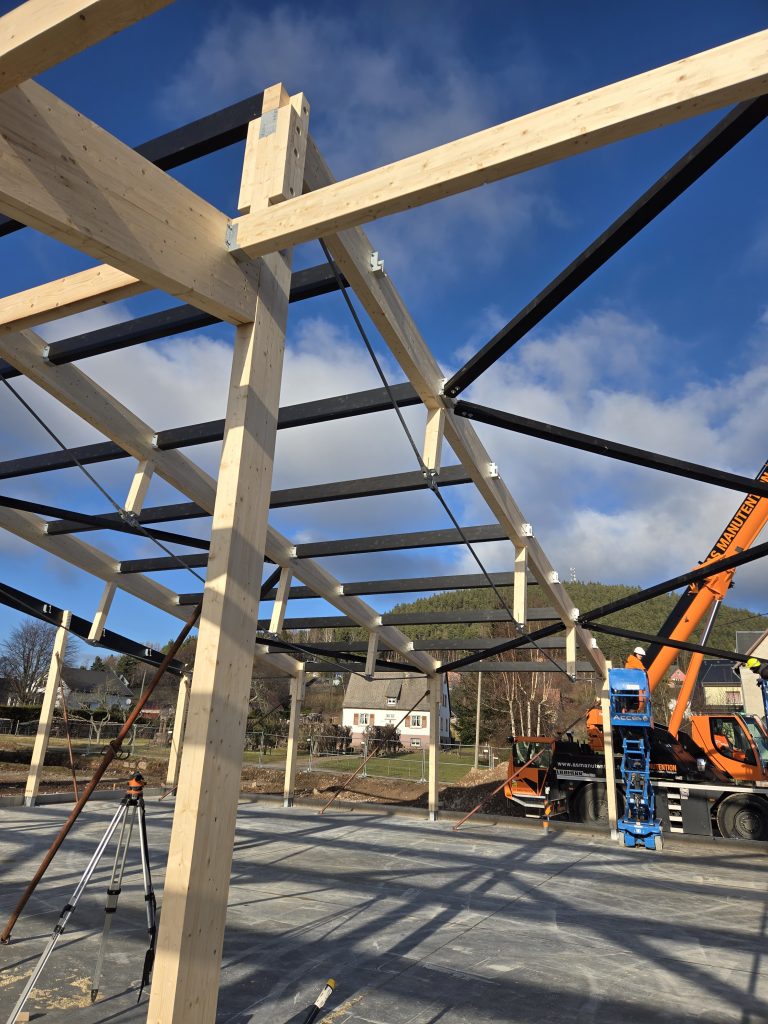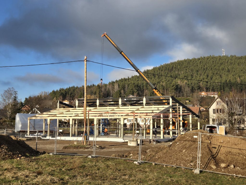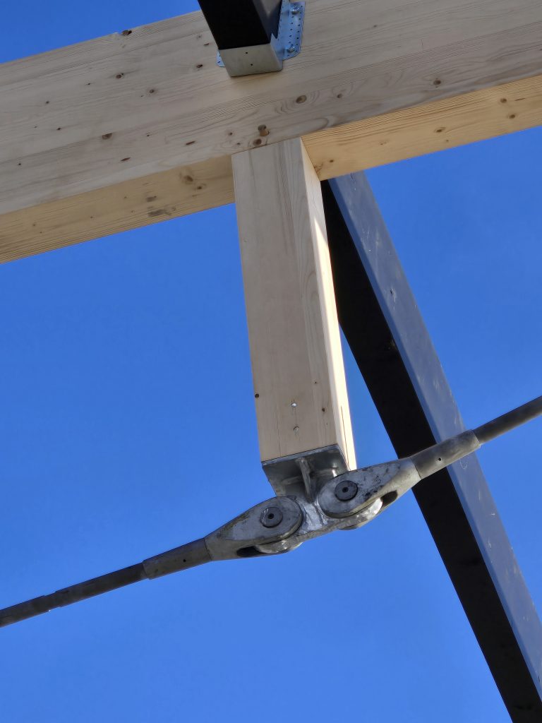 Associé à l’architecte Pierre Baumann , D-BOIS a proposé une structure mixte combinant l’utilisation du bois massif et du bois lamellé-collé associé à une sous tension en acier, l’ensemble étant enveloppé par des façades à ossature bois, et isolation biosourcée en fibre de bois.