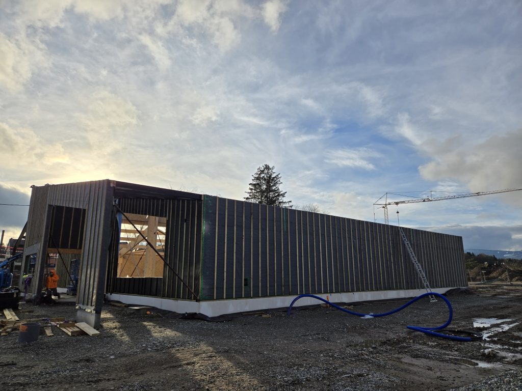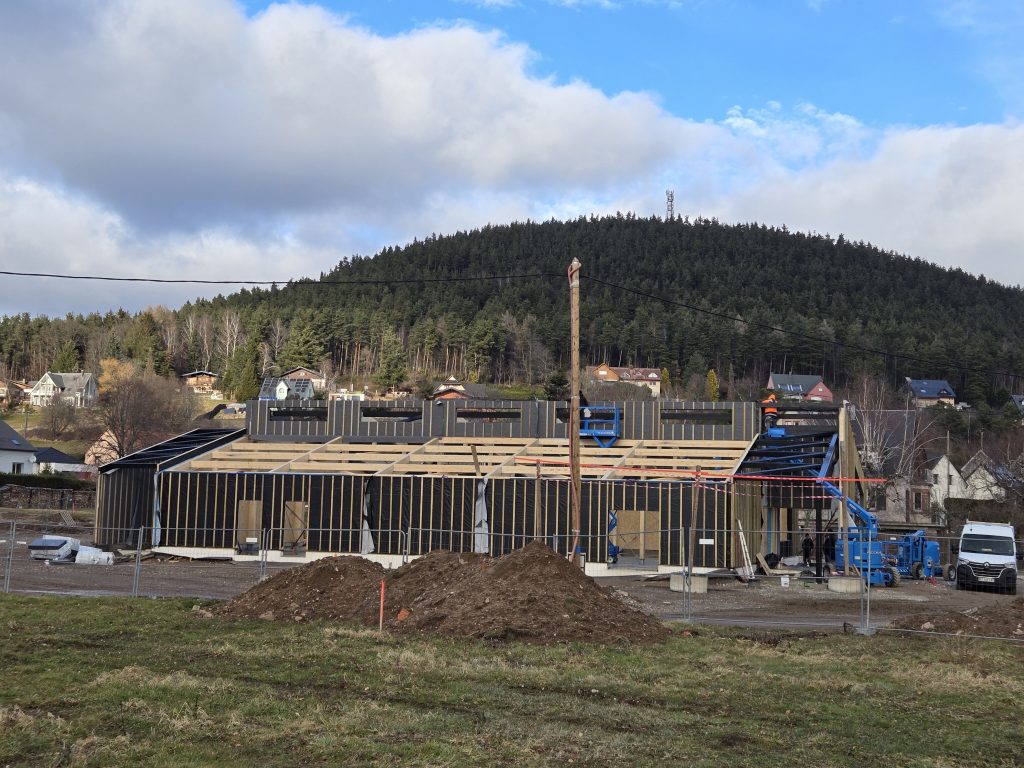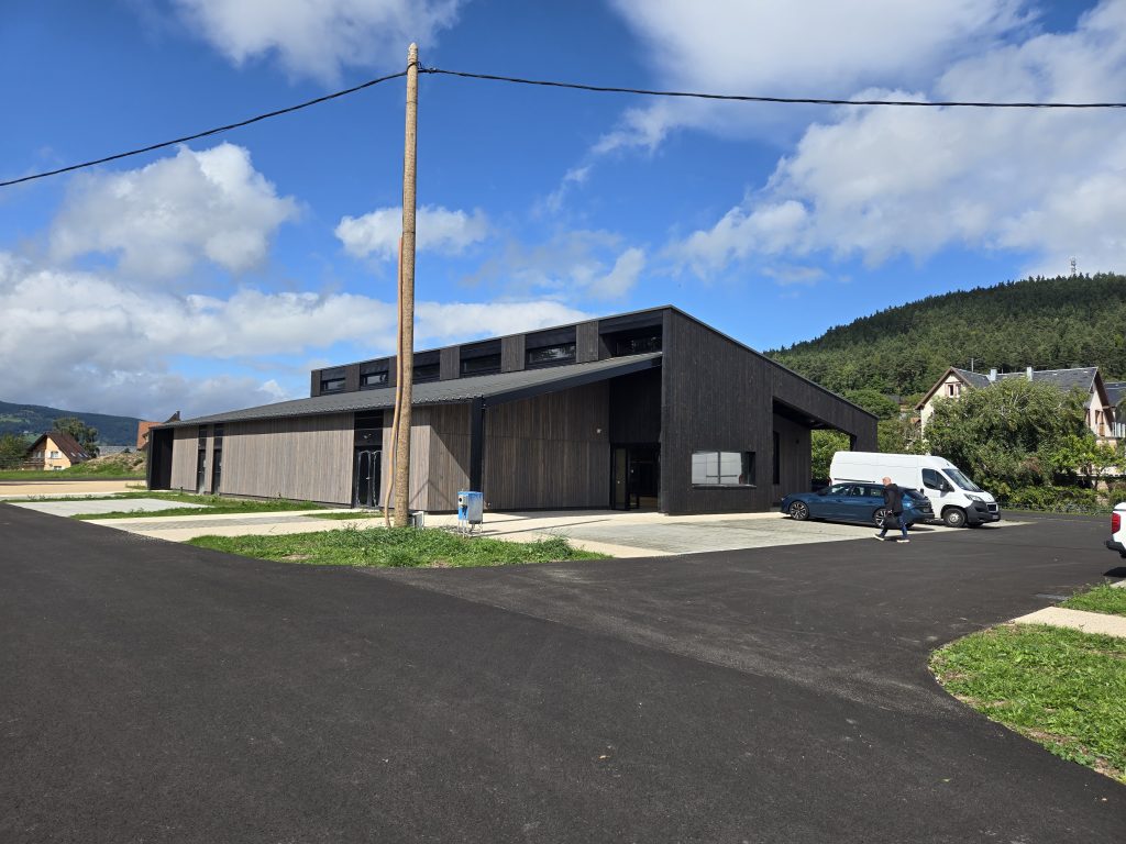 La réalisation et l’assemblage de la charpente et des façades en ossature bois a été confiée à l’entreprise Sertelet. La couverture et les facades bardées quant à elles ont été réalisées par l’entreprise Schoenenberger.