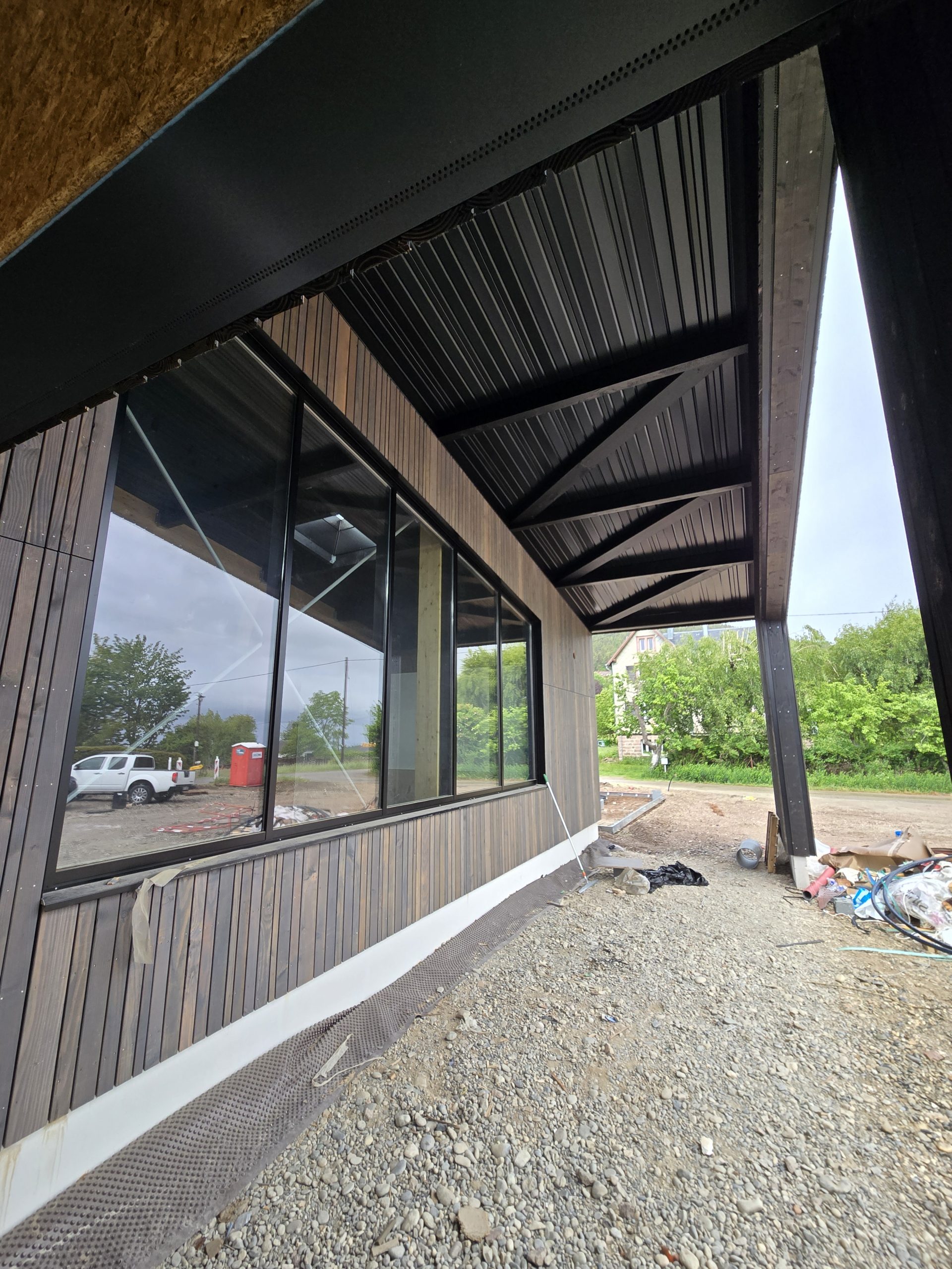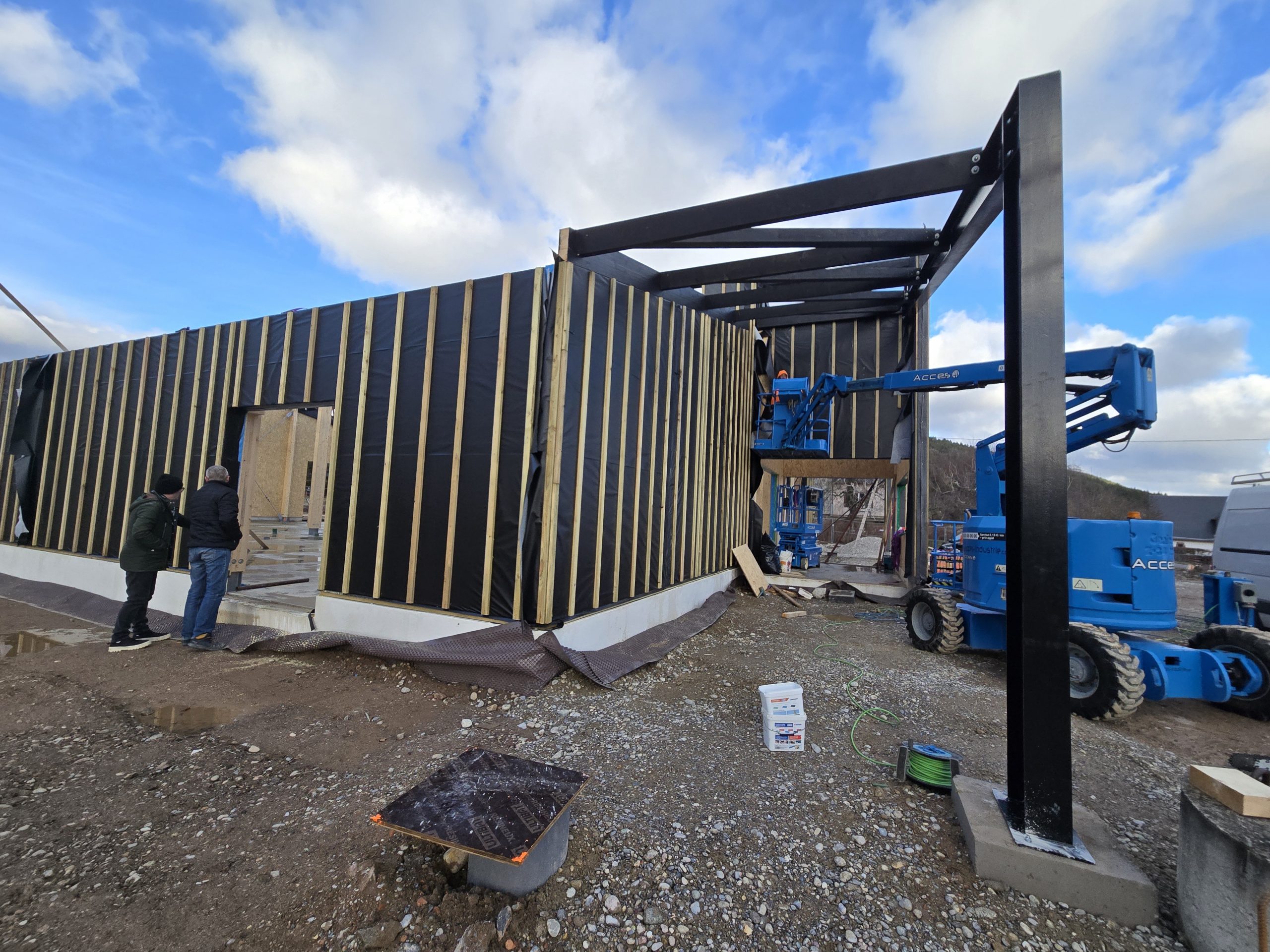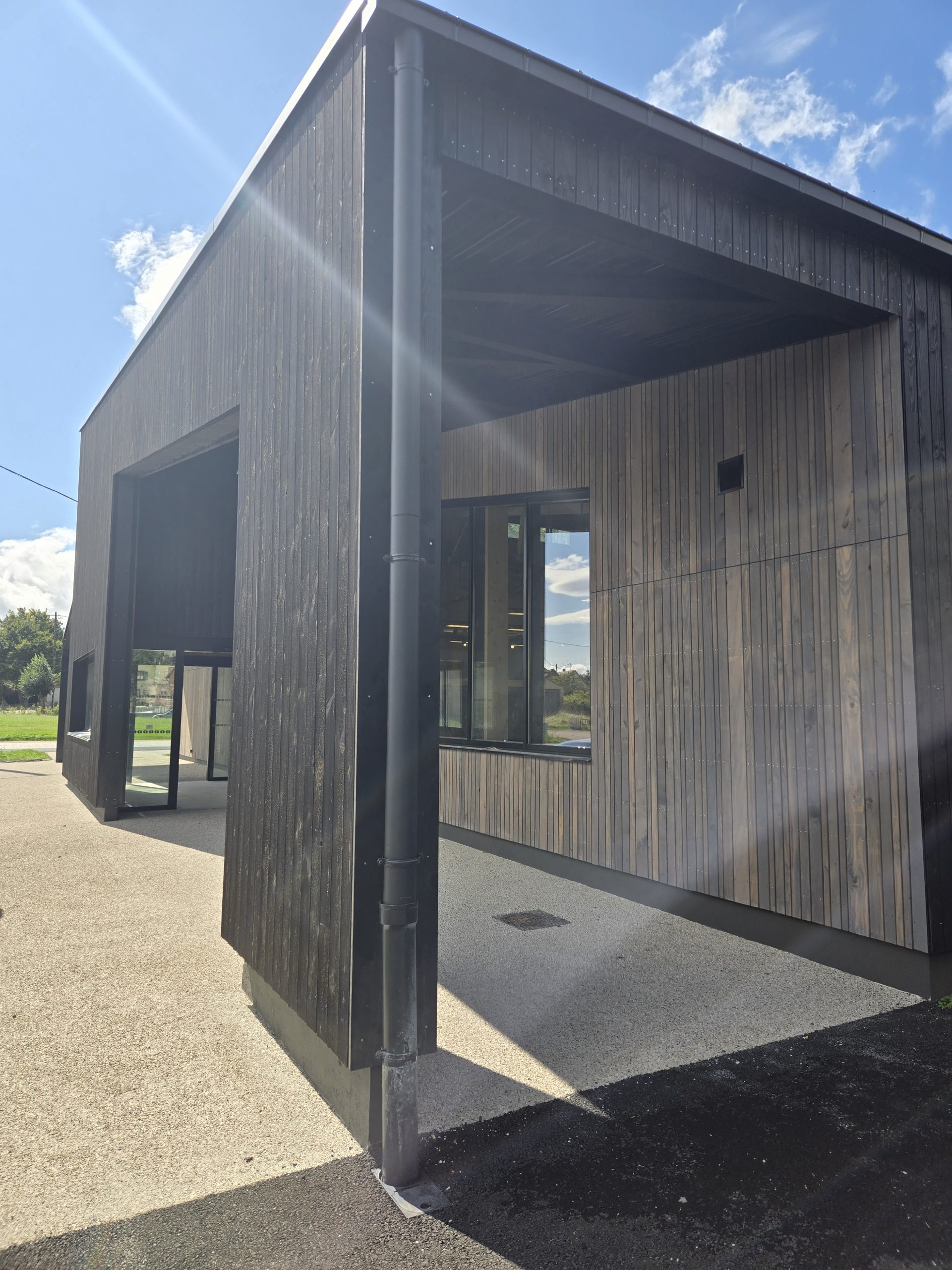 La réalisation et l’assemblage de la charpente et des façades en ossature bois a été confiée à l’entreprise Sertelet. La couverture et les facades bardées quant à elles ont été réalisées par l’entreprise Schoenenberger.